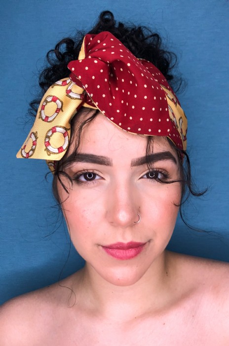 La fascia Vipuntozero può essere utilizzata in molti modi diversi: in testa (come fascia per capelli), al collo (fome foulard o collana di tessuto), o in vita (come cintura).